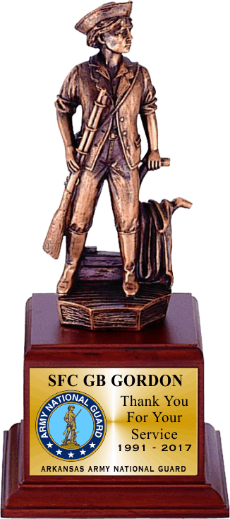 This is an electroplated copper resin figure on a wood base. The Minuteman figure